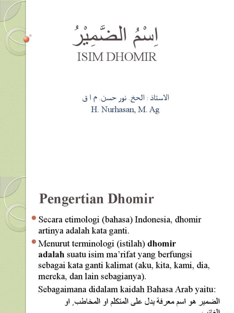Kata ( متصل ) dalam bahasa arab berarti sesuatu yang bersambung. Isim dhomir dalam bahasa indonesia disebut juga dengan kata ganti,. Isim dhomir bahasa arab ada 14, di antaranya dhomir untuk. Bisa saja kita tetap menyebutkan nama "budi" di setiap kalimat sebagai berikut. Kepada suatu ma'na yang tersendiri. Ada beberapa macam isim dhamir, dalam pelajaran bahasa arab kali ini. Pengertian isim dhomir dan contohnya contoh isim dhomir dalam al quran contoh . Isim dhamir bariz (kata ganti yang tampak) · العِلْمُ لَهُ فَوَائِدُهُ (ilmu itu memiliki banyak faedah atau fungsi). Berikut ini adalah contoh kalimat dari isim dhomir: . Maskulin (muzakar) dan feminism (muannas), sesuai bentuk kalimat mufrad (tunggal), dual (musanna) dan jamak (banyak). بﺋﺎﻏ وأ بطﺎﺧﻣ وأ مﻟﮐﺗﻣ ﯽﻟﻋ لدﯾ مﺳا رﯾﻣﺿﻟا. Memberi contoh dan penjelasan dan cara memakainya dalam kalimat. Isim dhomir (kata ganti) dalam bahasa arab juga dibagi menjadi kata ganti .
