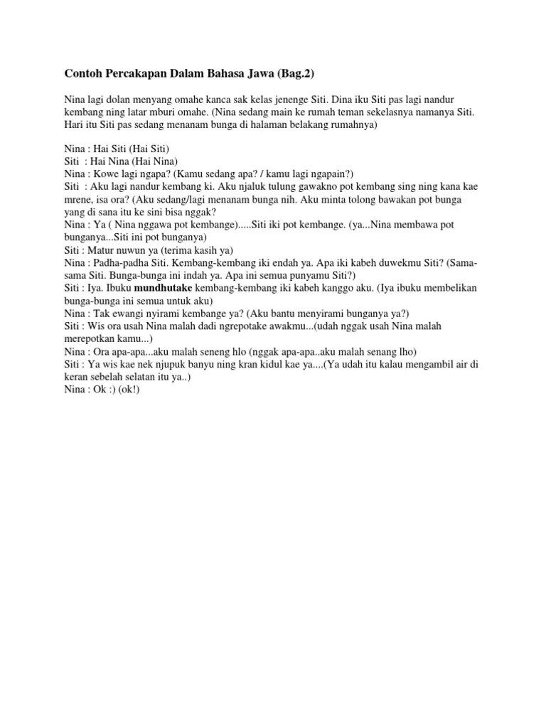 Bahasa jawa cirebon dieja oleh. ꦠꦶꦪꦁꦗꦮꦶ/ tiyang jawi) adalah suku yang terbesar di indonesia, dengan jumlahnya di sekitar 112 juta.mereka berasal dari pulau jawa dan menghuni khususnya di provinsi jawa tengah yogyakarta serta jawa timur tetapi di provinsi jawa barat, banten dan tentu sahaja di jakarta, mereka juga banyak ditemukan. Tetapi aksara ini tidak boleh berada di awal kalimat serta tidak ada penambahan pengkon. 24.07.2021 · 18 contoh teks negosiasi berbagai kasus baik dan benar dalam bentuk narasi, jual beli, lingkungan keluarga, sekolah, 4 orang. Aksara rekan sendiri merupakan aksara yang digunak. Meskipun dalam percakapan orang cirebon masih bisa memahami banyak kosakata bahasa jawa lainnya (bahasa jawa umum), dia mengatakan kosakata bahasa cirebon terus berkembang tidak hanya "mengandalkan" kosakata dari bahasa jawa maupun sunda. Saya kira, itu saja yang bisa saya sampaikan mengenai perkenalan ini. Contohnya saja dialek plered, jaware, dan … Teks perkenalan dalam bahasa inggris dan artinya untuk murid baru. Serta di luar indonesia seperti di suriname, belanda, dan malaysia. Verba transitif verba transitif merupakan verba yang dapat diubah ke bentuk pasif. Pada dialog di bawah ini terjadi kekagetan dari. Ayah saya bekerja di sebuah perusahaan kontraktor ternama dan ibu saya yang bekerja di rumah sakit.