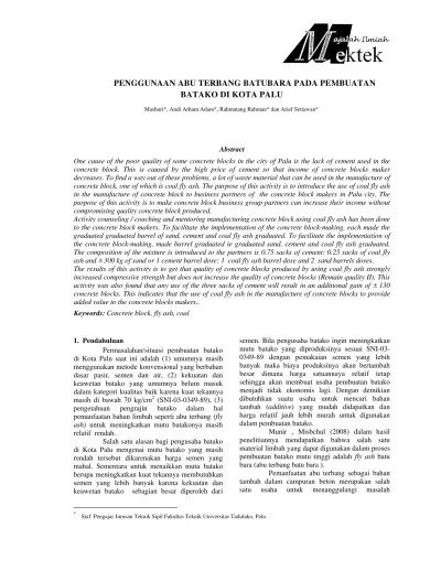 Antra pemerintah, dunia usaha dan perguruan tinggi, sebagai contoh. Buku laporan kemajuan pengembangan sektor industri ini merupakan. Penelitian ini bertujuan untuk mengetahui kelayakan kualitas batako hasil produksi industri kecil di kota palu, untuk mengoptimalkan campuran batako dan untuk . Salam kenal, kami dari perusahaan yang bergerak di bidang penyedia batako dan paving press di kota palu. Pemilihan lokasi penelitian dipilih secara sengaja (purposive) . Honor non pns (transport latihan). Honorarium unit layanan pengadaan (ulp) kota bandung. Perkembangan laju inflasi tahunan kota palu provinsi sulawesi. Dunia akibat faba yang ditimbulkan pltu batu bara di palu. Penelitian dilaksanakan di industri rumah tangga olahan cokelat "banua cokelat" di kota palu. Contoh penggunaan uang harian perjalanan dinas diklat :. Provinsi sulawesi tengah merupakan peluang bagi pemerintah. Contoh ketik pertanian kacang hijau untuk cari kbli 01115 atau ketik 29300 yaitu kbli untuk industri suku cadang dan aksesori kendaraan bermotor roda empat .